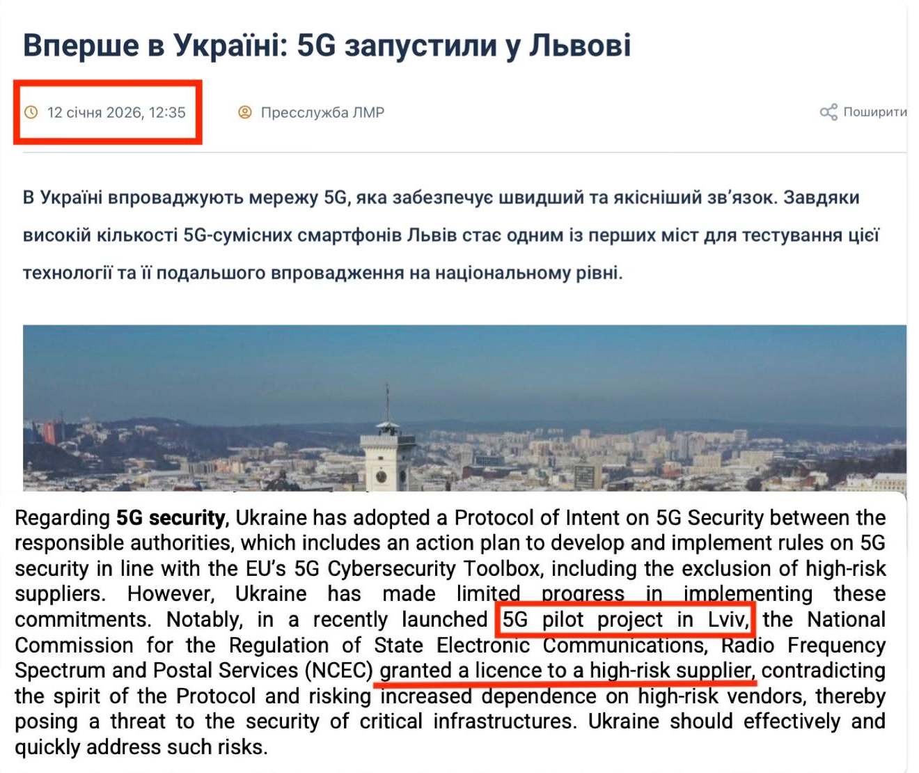 In the European Commission’s 2025 report on EU enlargement policy, it is specifically noted that Ukraine granted licenses to high-risk suppliers during the implementation of a 5G pilot project in Lviv, of which the then Minister of Digital Transformation, M. Fedorov, was so proud. A deeper internet search reveals that within this project, Huawei AAU5636m radio modules were installed on the Lviv City Hall, although the manufacturer’s name does not (for some reason?) appear in the official triumphant press releases.