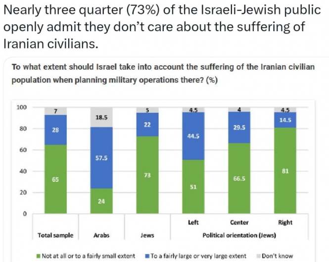 That is why I will remind you that while Israelis target Iranian nuclear scientists and nuclear facilities (and they were the first to start doing this), they have also killed dozens of Iranian civilians. Especially in June of last year. Furthermore, as surveys like the one below show, the Israeli public simply does not care how much Iranian civilians suffer from their (and American) bombings.