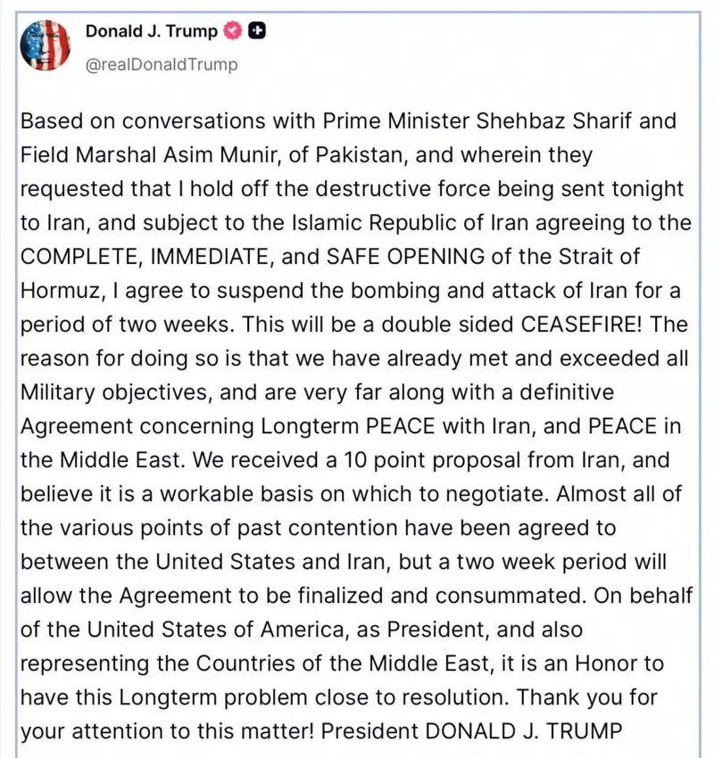Approximately an hour after Trump’s statement, Iranian Foreign Minister Abbas Araqchi, as well as separately the Supreme National Security Council, announced that Tehran agrees to a two-week ceasefire and the resumption of shipping through the Strait of Hormuz.