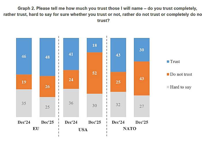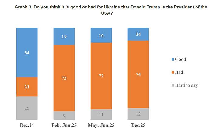 In a study by the Kyiv International Institute of Sociology, published in early 2026 but based on data from late 2025, it is very evident how trust in the US plummeted during 2025, while trust in Europe remained at the same level or even increased.