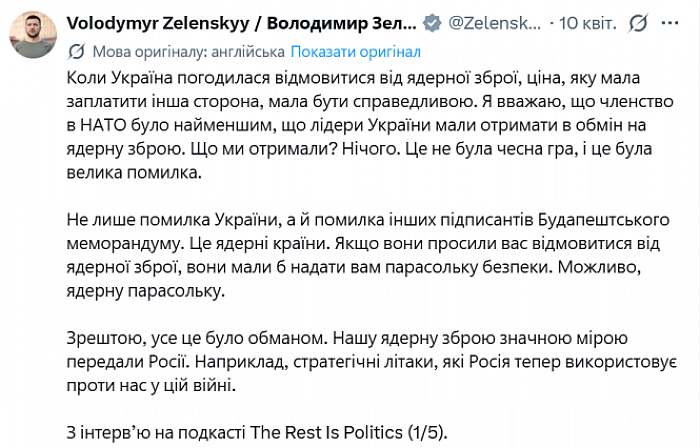 And that’s not all. Further in the same tweet thread, Zelensky stated that the US is trying to force Ukraine to give up Donbas, while questioning the significance of American security guarantees. What did Ukrainians get for giving up nuclear weapons under US pressure at the time? Nothing.