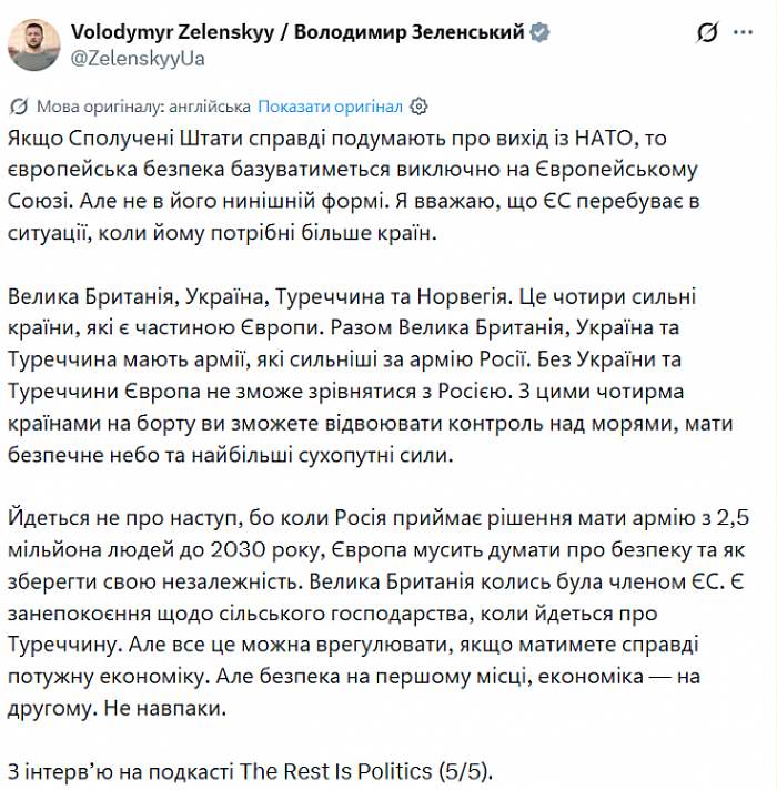 Shortly after his publication, Zelensky went even further. In a tweet addressed directly to European politicians, Zelensky stated that Europe should plan its defense relying solely on European resources, without the involvement of the US. To prepare for such a world, Zelensky called for rather radical measures – creating new and expanding existing structures. Interestingly, he called for Turkey to be included in a new, updated European security structure (which seems to be a kind of more unitary European Union). It is worth reading the entire statement carefully.