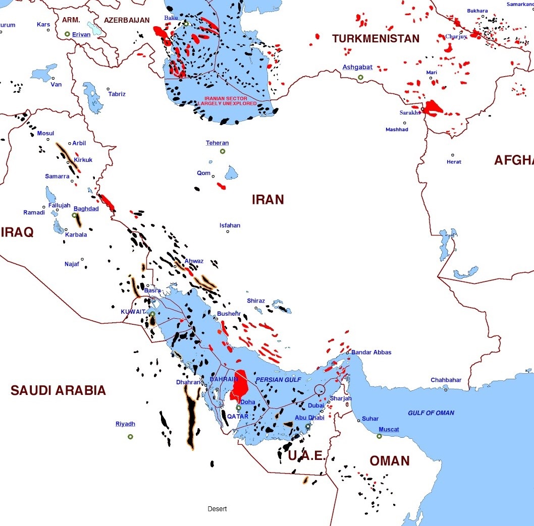 For example, a large red spot in the center of the Persian Gulf is the largest gas field on the planet. A shared reservoir from which Iran (its part is called South Pars) and Qatar (North Fields/North Dome) draw.